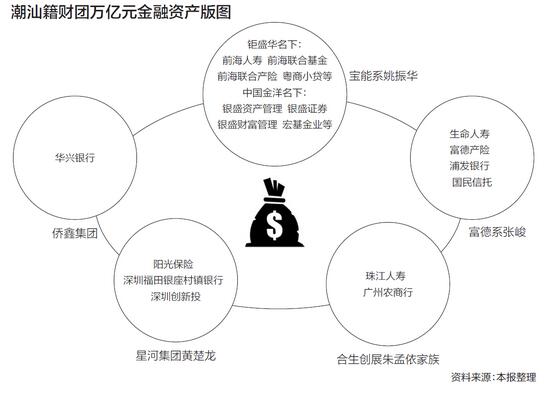 一貫的低調神秘,讓外界無法確知潮汕商幫所控制的金融機構,以及對應的金融資產規模究竟大到何種程度,但毫無疑問的是,這一群體所控制、影響的金融資產堪稱天量。根據公開數據測算,僅富德系、寶能系、朱孟依家族、僑鑫集團等四家潮汕籍財團,所控制、影響的金融資產至少可能就已達到1.1萬億元以上。