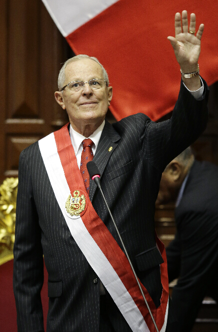 7月28日,在秘鲁首都利马,秘鲁当选总统库琴斯基(中)出席就职仪式后向众人挥手致意。