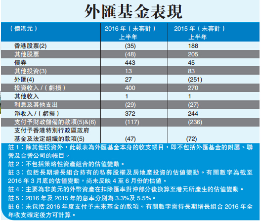 金管局总裁陈德霖表示,上半年金融市场表现十分反覆,投资环境非常动荡。1月至2月初,市场忧虑全球增长放缓及商品价格进一步下跌,香港及主要环球股市大幅下挫。市场气氛其后好转,但走势反覆。环球金融市场在6月下旬举行的英国脱欧公投前后更为波动。他指出,面对困难的投资环境,金管局凭着稳健的资产组合设计与采取一些防御性部署,加强外汇基金的抗震能力,使外汇基金在上半年录得400亿元的投资收入。