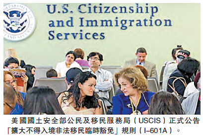 奧巴馬總統2014年11月簽發的移民改革行政令,雖然擴大「年幼無證移民暫緩遣返」(DACA)及「美國公民父母暫緩遣返」(DAPA)等項在最高法院遭到挫折,但其他項目並未受阻,包括擴大臨時豁免。USCIS在去年7月22日公告擴大臨時豁免的草案,並開放60天徵詢公眾意見,最終在29日發出上述公布。