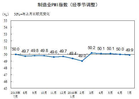 據中國統計局數據顯示,2016年7月份,中國制造業采購經理指數(PMI)為49.9%,比上月下降0.1個百分點,微低于臨界點。新訂單指數為50.4%,雖比上月微落0.1個百分點,仍保持在臨界點之上,表明制造業市場需求增速略有放慢。