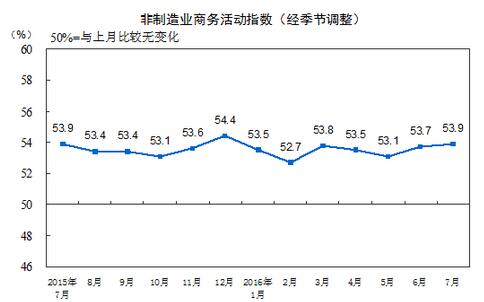 2016年7月份,中國非制造業商務活動指數為53.9%,比上月上升0.2個百分點,連續兩個月回升,非制造業穩中向好,增速略有加快。