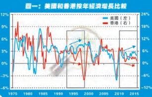 不過,仔細看看就會發現,仍有些時間的港美經濟出現背馳情况。美國經濟自2009年后持續復蘇,股市一直破頂,故圖中見到美國按年經濟增長趨於向上。奈何香港經濟增長於2010年已經見頂,至今增長已跌近6年,且仍未有反彈迹象,這與過去多年來的同升同跌大相逕庭,而1994年起至1998年亦曾發生類似情况,與近年美強港弱差不多。