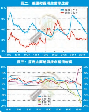 除了經濟增長外,還有其他數據可看到背馳情况嗎?筆者拿了耶倫用來衡量應否加息的其中一個主要因素之失業率來對比一下。圖二見到,在圖一顯示的1994年至1998年間,當香港經濟增長下滑之際,失業率亦同時在低位持續抽升,1997年金融風暴后的升速更為急遽,與美國的失業率逐步下跌完全是兩碼子事。另外,雖然近年香港失業率未如1990年代般由低位反彈,但起碼與美國失業率持續下滑有別,而且近年香港失業率亦似在低位造底。結合圖一分析,現時港、美經濟確實見到歷史少見的背馳情况。