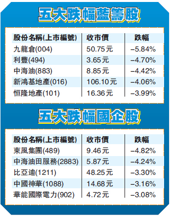 其他重磅股方面,今年以來節節向上的騰訊(700)繼續調整,收跌1.6%至181.5元,拖低恒指36點。申請發行不超過200億人民幣債務融資工具的九龍倉(004)是表現最差的恒指成分股,收跌5.8%至50.75元,緊隨其後的是利豐(494)與中海油(883),分別跌4.7%和4.4%。
