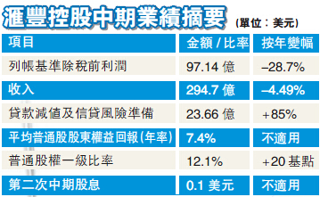 今年上半年,亞洲區仍是匯控最大盈利來源,占上半年稅前盈利73.7%,但半年稅前盈利倒退近24%,至71.55億美元。其中,香港占亞洲區盈利約58%,惟因投資信貸需求放緩,股市交投亦大幅萎縮,半年稅前盈利跌33%。