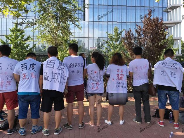 8月3日,眼見溝通無望的代理商們開始找來白T恤、白襯衫或者白浴巾,用馬克筆醒目地寫上“百度無恥”、“百度欺詐”和“百度還錢”等,前往百度門前抗議。
