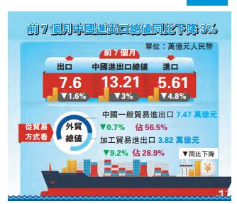 海關總署昨日公布最新進出口數據顯示,7月中國進出口總值2.09萬億元,同比下降0.9%。其中,如按人民幣計價,出口為1.22萬億元,增長2.9%;進口8730億元,下降5.7%;貿易順差3428億元,擴大34%。專家認為,由於前段時間人民幣貶值的關系,雖然7月出口按人民幣計價為增,但若按美元計價則降低了4.4%,這使得出口復蘇勢頭有限,總體仍處於穩定狀態。受國際因素與內地成本增加的影響,國內外貿形勢在下半年料不會出現較大反彈,穩增長仍需依靠內需增長。香港商報記者伍敬斌