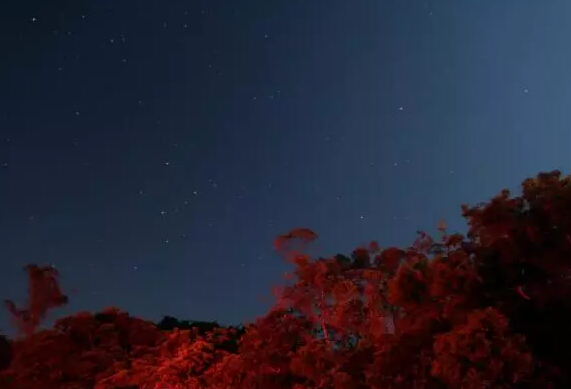 同道中人开车离开时识趣地没开大灯,但车尾的红灯却将山头染成红红一片。
