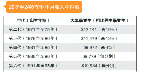 文汇报报道称,研究显示,愈年轻的世代拥有大专学历的青年,其收入中位数与同龄只有高中学历者相比较,优势愈来愈少,至近年20岁出头的一群人,两者收入中位数只得一样,即学历根本未能改善待遇,反映大专毕业青年在香港欠缺议价能力,只能透过继续升读大学学位课程,才能提升竞争力和收入水平。报道指,不同世代的大专毕业生在起薪点和上流速度,愈年轻愈趋下降。以第二代至第六代大专生在20岁至24岁时为例,第二代的大专毕业生收入中位数为12,141元,直至第五代下跌至约9779元,直至第六代才略为回升至10934元。