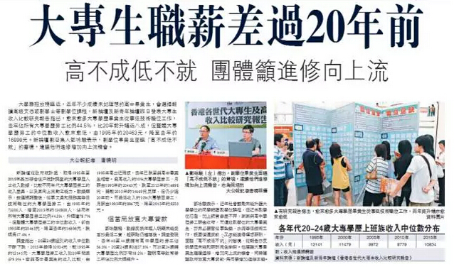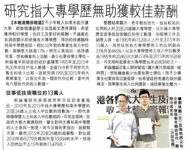 成报报道称,新论坛研究员指出,2010年及2015年持大专学历和高中学历的20至24岁人士收入中位数的倍数为一,即代表两种学历人士的收入中位数相同,显示雇主对待大专和高中学历的人士是同一态度。整体结果显示,愈年轻的世代,就有较高的比例的人于20至24岁拥大专学历。另外拥大专学历并从事低技术职位的劳工数量,如服务工作及销售人员,由1995年的73,200人上升至2015年约13万人,可见现时就算有大专学历也未必找到好工。