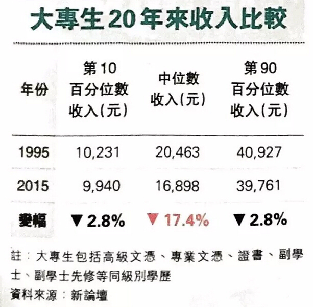 大公报报道称,最高收入的10%大专学历劳工,月薪由1995年的20463元,跌至2015年的16898元,虽较2010年的14669元反弹,但仍少过20年前。而最低收入的10%大专学历劳工,月薪由1995年的8867元,降至2015年的8250元。