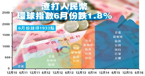 【香港商報網訊】受離岸人民幣需求降拖累,渣打昨日公布最新渣打人民幣環球指數,由5月的1968點跌至6月份的1933點,按月跌幅1.8%,創近9個月以來的第8次下跌,惟跌幅有所放緩。不過,指數自2015年8月匯率改革以來已累積下跌近20%,同期的在岸人民幣兌美元亦錄得6.5%的跌幅。香港商報記者 林德芬