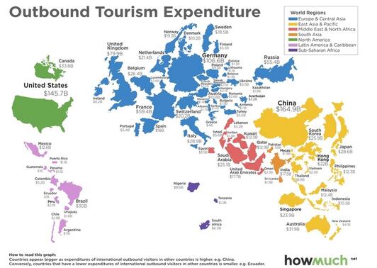 以下資訊網站HowMuch.net根據世界銀行數據制作的圖表顯示,2014年,中國境外游消費高達1649億美元,比位居第二的美國高192億美元,比第三位德國的這類消費高出640多億美元。