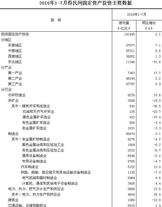 分地區看,東部地區民間固定資產投資87577億元,同比增長7.1%,增速比1-6月份回落1.1個百分點;中部地區55721億元,增長5.6%,增速加快0.5個百分點;西部地區36852億元,增長1.3%,增速回落0.6個百分點;東北地區11346億元,下降31.6%,降幅收窄0.3個百分點。