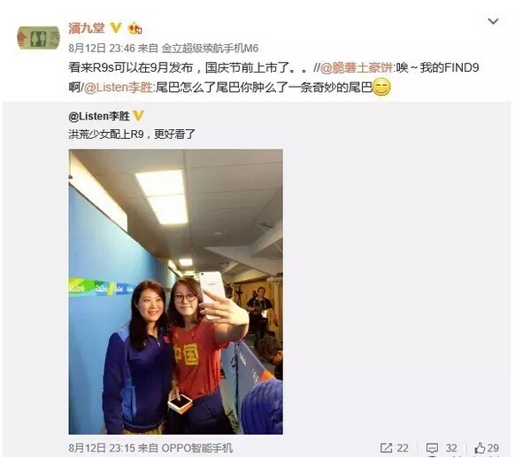 而在此之前,OPPO的一個產品經理發了個照片,顯示傅園慧在拿著一個OPPO手機自拍。當然從時間上來看這時候傅園慧的手機還沒被偷。