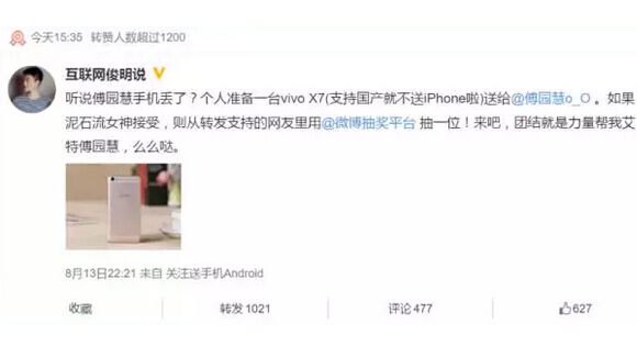 蘇寧手機也發布了一條官方微博:“上群眾的聲音,傅叔叔傅大王要不要理我一下。”最后,甚至還有微博大V以個人身份自愿給傅園慧送手機。