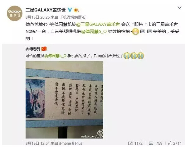 聽說傅園慧丟手機,一堆手機廠商搶著送!三星Galaxy蓋樂世官方微博轉發傅爸爸的微博稱:“傅爸爸放心,等傅園慧凱旋@三星GALAXY蓋樂世會送上即將上市的三星蓋樂世Note 7一臺,自帶美顏相機供@傅園慧o_O 繼續拍拍拍,美美的,妥妥的!”