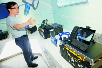 潘建偉院士演示實用化量子通信產品進行遠距離保密通話。新華社發