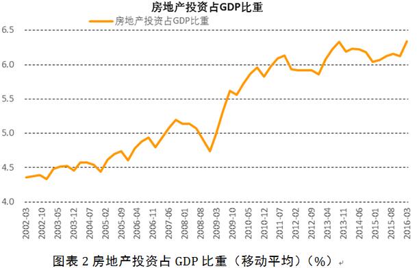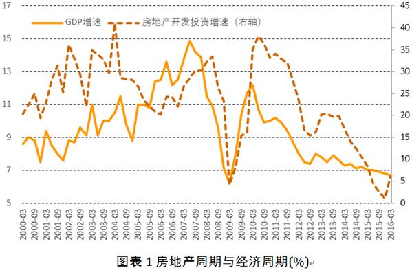 2009年后我國房地產周期與經濟周期基本同步。簡單的數據分析顯示,金融危機之后我國房地產投資和GDP增長的周期重合度顯著提高,2009年以后房地產投資占GDP的比重也從以往的5%以下快速上升到6%以上。2008年以前房地產投資增速和GDP增速并無明顯的同步關系,而2008年至今兩者的相關系數高達到0.76。2016年一季度房地產投資回升更是成為GDP增長的主要動力。