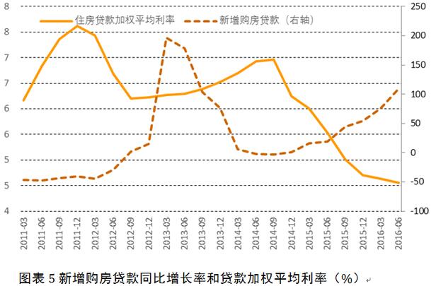 收入(預期)是中長期影響購房需求的關鍵因素,但短期內的支付能力在很大程度上受貨幣政策(如降息)的影響。雖然家庭居民收入的增長隨著GDP增長的放緩而有所放緩,但貸款基準利率的下調也相應減輕了按揭貸款的負擔。理論上房屋價值應等于未來房租收入的凈現值,作為折現率的貸款利率下行意味著預期房價上漲,有利于提振購房需求。住房貸款利率與新增個人購房貸款額呈明顯的負相關(圖5),顯示居民住房貸款需求對利率的變化非常敏感。