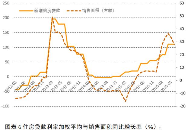 如前文所述,近10年來我國的經濟周期與房地產周期在很大程度上是重合的,因此無論面向整個經濟體的貨幣政策變動還是針對房地產市場的信貸政策變動,利率/信貸周期基本與新增購房貸款的增長呈反向變動,住房貸款利率的拐點出現后幾個月內,購房貸款增長也會達到拐點。由于新增購房貸款與房地產銷售狀況密切相關,住房貸款利率通過信貸增長傳導至銷售端,信貸周期與商品房銷售面積增速也呈現明顯的負相關(如圖6所示)。