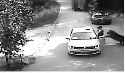 劉某下車,向前追趕幾步又返回。15時00分32秒,周某打開左后車門與劉某追至該平臺坡下。15時00分33秒,標號為3號的巡邏車拉響警報沖上柏油路,對虎進行驅趕。同時用對講機呼叫標號為8號的巡邏車進行支援。