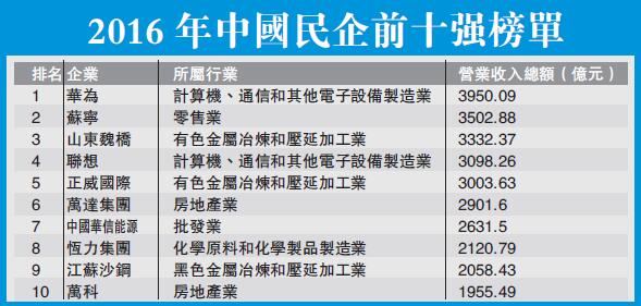 【香港商報网訊】由全國工商聯發布的「2016中國民營企業500強榜單」昨日揭曉,華為控股有限公司以營收總額3950.09億排名第一,蘇寧控股、山東魏橋集團分別以3502.88億、3332.38億分列二、三位。