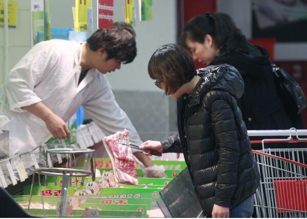 顧客在上海一家超市內選購豬肉(2016年3月14日攝)。新華社發