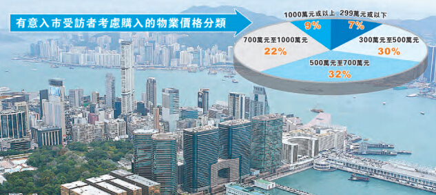调查亦反映有意入市的受访者当中,有69%会选择购买中细价物业,当中以价值介乎500万至700万元的物业占比最重,达32%,其次为300万至500万元物业,占30%。