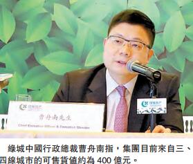 為配合去庫存政策,內房近年積極促銷三、四線城市項目。綠城中國行政總裁曹舟南昨於記者會表示,集團目前來自三、四線城市的可售貨值約400億元,按現時銷售步伐估計,年底前只會剩餘約230億元。