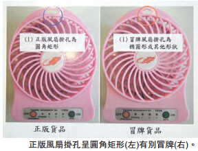 海关版权及商标一般调查组指挥官黄蕙荃昨日表示,市民可从5点分辨手提式风扇真伪。首先,正版风扇顶圈挂孔为圆角矩形(近似长方形),冒牌的为不同形状。而风扇背面中间位置,正牌的没有开孔及电线外露,冒牌的有开孔及可看见外露电线。另外,正版在扇叶胶面已印上商标,电池槽内印上商标及产品序号,锂电池贴上商标及bar code,以上3点冒牌货均没有。有商舖更将冒牌的风扇与正牌的混合售卖,企图以假乱真;另外,冒牌的售价约20至50元,正牌的售价约40至60元不等。