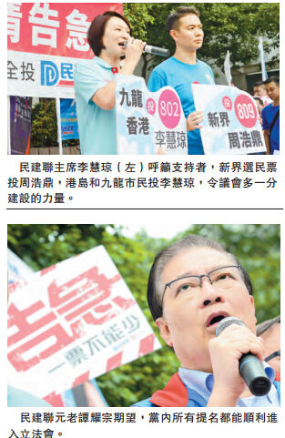 昨日,民建联在葵芳为该党新界东、新界西及超级区议会候选人造势,宣布选情告急。党主席、超级区议会候选人李慧攌表示,期望党内两张名单都能胜出,故必须做好配票策略。她呼吁支持者踊跃投票,住新界的选民投票给周浩鼎,住港岛和九龙的市民投票给李慧攌,让民建联能赢取超级最后一席,令议会多一分建设的力量。