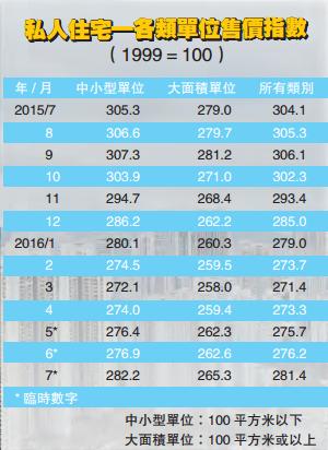 數據顯示,按年計,7月份私人住宅樓價指數跌7.46%。按單位細分,面積100平方米以下的中小型單位售價升1.91%;100平方米或以上的較大面積單位售價,則上升1.03%。經近月持續彈后,由今年初至今,本港樓價指數跌幅收窄至1.3%。分析認為,美國加息步伐尚未確定,加上本港失業率上升風險仍在,香港樓價再度下滑的風險尚未解除,整體樓價要重返去年第三季的高位,可謂難上加難。