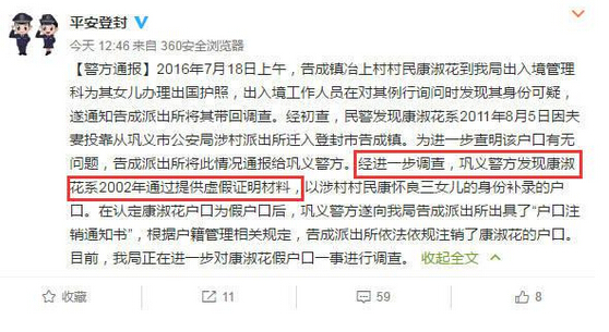 9月1日中午12時46分,登封警方通過微博,發出了“警方通報”。通報上說:“2016年7月18日上午,告成鎮冶上村村民康淑花到我局出入境管理科為其女兒辦理出國護照,出入境工作人員在對其例行詢問時發現其身份可疑,遂通知告成派出所將其帶回調查。經初查,民警發現康淑花系2011年8月5日因夫妻投靠從鞏義市公安局涉村派出所遷入登封市告成鎮。為進一步查明該戶口有無問題,告成派出所將此情況通報給鞏義警方。經進一步調查,鞏義警方發現康淑花系2002年通過提供虛假證明材料,以涉村村民康懷良三女兒的身份補錄的戶口。在認定康淑花戶口為假戶口后,鞏義警方遂向我局告成派出所出具了“戶口注銷通知書”,根據戶籍管理相關規定,告成派出所依法依規注銷了康淑花的戶口。目前,我局正在進一步對康淑花假戶口一事進行調查。”