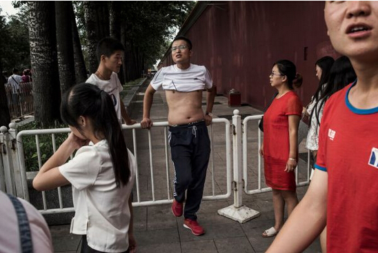 北京故宮附近,一名男子將上衣卷起。用一種叫作“北京比基尼”的方式來保持涼爽。(圖片來源:美國《紐約時報》網站)