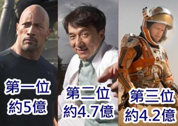 数完女星自然就要数男星,今年吸金力最强的男星就是人称“The Rock”的大只佬男星强森(Dwayne Johnson),上年凭两部热卖电影《速度与激情7》(The Fast and the Furious 7)和《末日崩塌》(San Andreas)狂揽6,450万美元(约5亿港元),比起上年吸多了超过一倍,相比起女星方面,足足高了1.4亿港元。