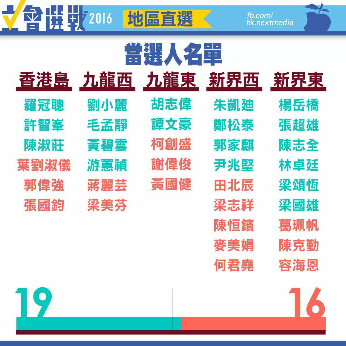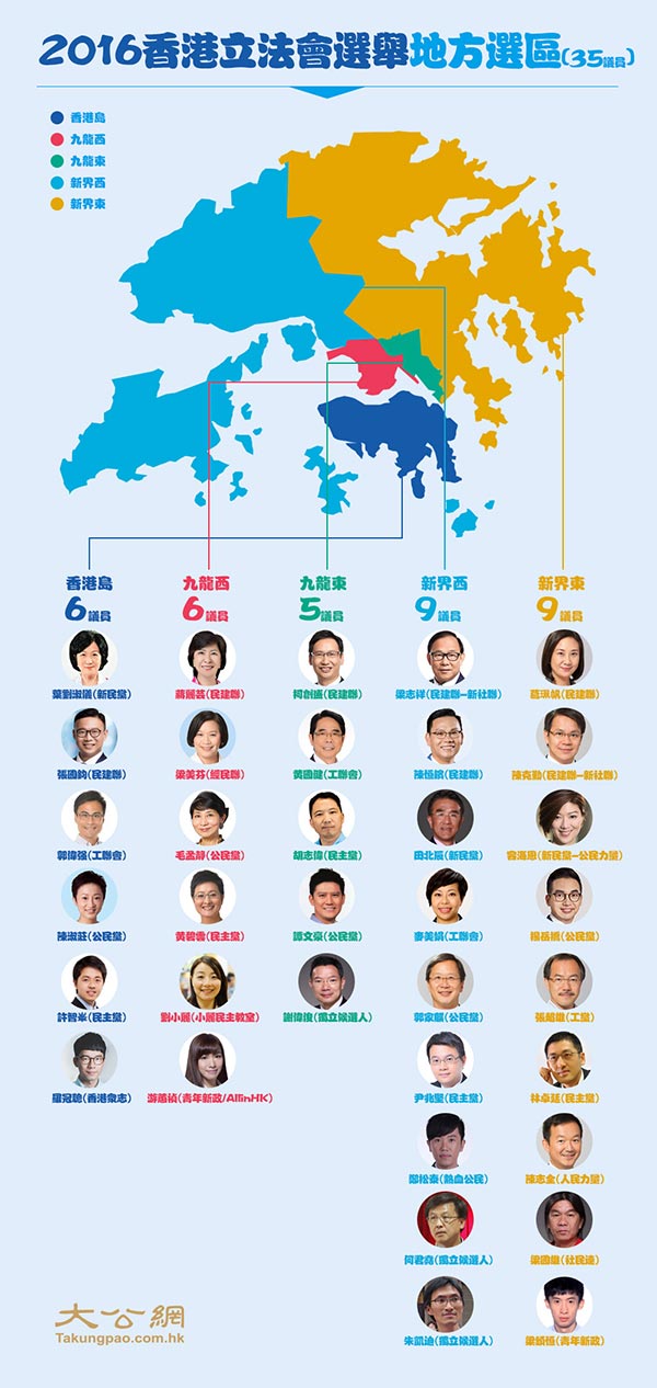 新民党叶刘淑仪、香港众志罗冠聪、民建联张国钧、民主党许智峯,工联会郭伟强,公民党陈淑庄。