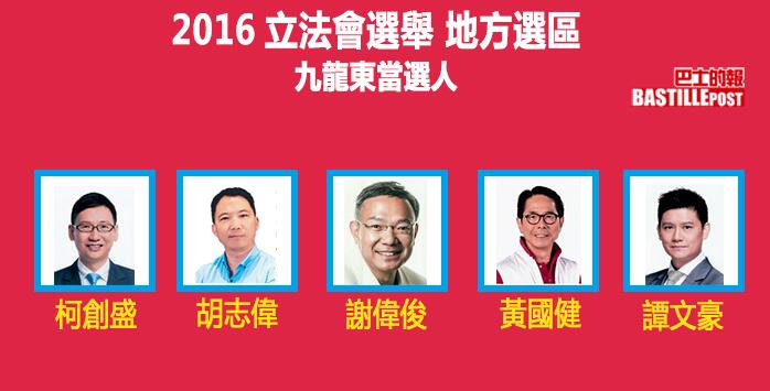 民建联柯创盛、民主党胡志伟、独立谢伟俊、工联会黄国健、公民党谭文豪。