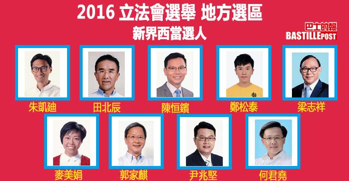 在九龙西选区,共有15张名单争夺6个议席,选情相当激烈,民建联的蒋丽芸和经民联的梁美芬成功连任,而一向言行激进的黄毓民,终於被选民用手中一票赶出议会。在新界西选区,受人民力量陈伟业力捧的黄浩铭谋进立会失败;而以独立身份参选的何君尧,则以超过5000票的优势,成功击败「身缠黑金」的工党李卓人。包括李卓人在内,有4名现任泛民议员承认落败,另三人分别是:冯检基、何秀兰、范国威。九龍西選區6名當選的議員全部都是清一色的女性。當區得票最多的是民建聯的蔣麗雲,有5萬2千多名選民投票給她。經民聯的梁美芬也成功連任,得票逾4萬9千票,九龍西新丁劉小麗以38183票排在第三,公民黨毛孟靜、民主黨的黃碧雲也成功保住議席。至於最後一席,青年新政的游蕙禎僅以424票險勝普羅政治學苑的黃毓民。