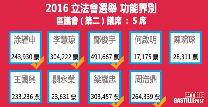 区议会(第二)功能界别(俗称「超级区议会」)点票结果宣布,民主党新丁邝俊宇在党元老力撑下以逾49万票大幅抛离对手获选,李慧琼、梁耀忠、周浩鼎及涂谨申均获选,工联会的王国兴以逾万票之差,未能连任立法会议员。