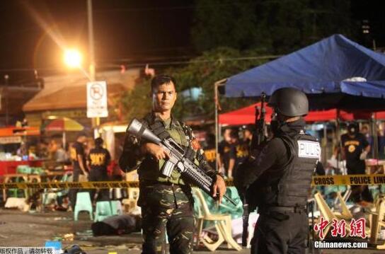 当地时间9月2日,菲律宾南部重镇达沃市一夜市发生爆炸事件。图为菲律宾警方在事发现场。
