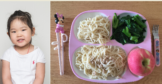 在香港,3岁半的幼儿园小班学生吕昊妍在家准备吃由爸爸准备的午餐──有机面配猪肉、菜心和苹果(9月2日摄)。