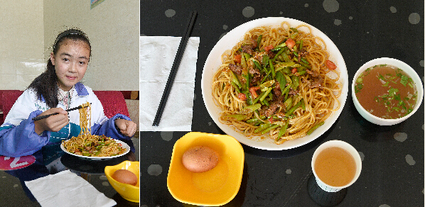在宁夏吴忠市红寺堡区,今年15岁的红寺堡区第二中学初三学生马璐在学校附近的一家餐厅吃午餐──干拌菜肉面、面汤和一枚茶叶蛋(9月2日摄)。实惠、快捷的当地知名美食干拌菜肉面是课业紧张而无法回家吃午饭的初三学生的最佳选择。