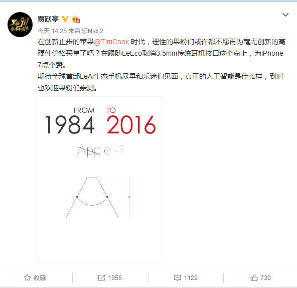 樂視CEO賈躍亭在微博上就為蘋果跟隨樂視取消傳統耳機接口,給蘋果點了7個贊。Excuse me?蘋果去年就爆出了要取消耳機接口,樂視不過在今年5月發布的手機上取消了傳統耳機接口,這就叫做跟隨了?