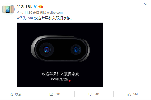 華為手機在微博上“歡迎”蘋果加入雙攝家族,然而這個熱點貼合的並不成功,反而給出了其他廠商的宣傳文案。有網友評論中寫道“@一加手機: 歡迎蘋果加入不能按壓home鍵家族。@樂視移動 歡迎蘋果加入沒有耳機孔家族。”