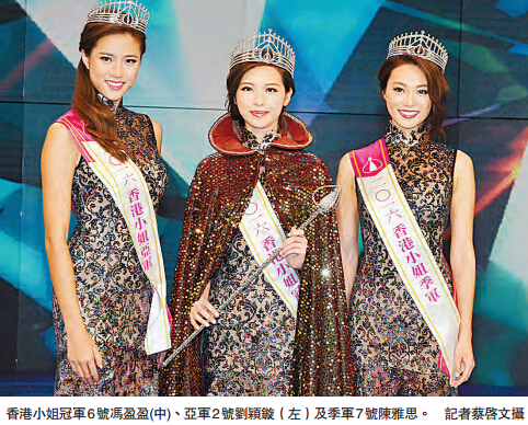 【香港商报网讯】记者云逊报道:《2016香港小姐竞选决赛》昨晚在电视城圆满举行,今届无线破天荒同时选出《2016香港先生》冠、亚、季军。结果在逾23万名香港观众投票後,由得36,679人支持的6号冯盈盈摘下后冠,亚军2号刘颖镟、季军7号陈雅思。「香港先生」由4号黎振烨以44,420选票称王,登上冠军宝座,亚军9号丁子朗、季军1号锺君扬。