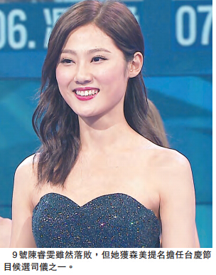 在中大修读研究生的9号陈睿雯,虽然落选,但她坦言已经努力苦练舞步及尽力表现,可惜因在港亲友不多,故未能增取更多票数:「不过很开心妈妈可以来港看我的今晚演出。」虽然落选,陈睿雯希望可以留港发展加入娱乐圈,能签约无线为主要目标,她笑言是为了加入无线才参加港姐。