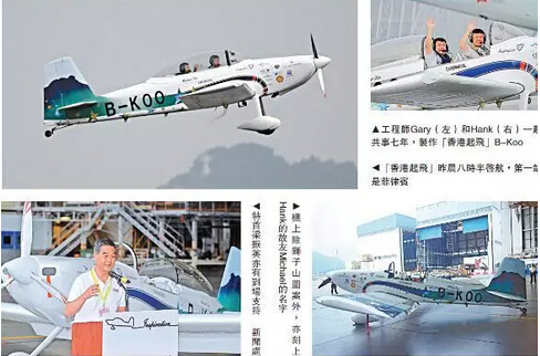 大公报报道:香港首部自行组装的小型飞机“香港起飞”(注册编号“B-KOO”),筹备8年,昨早顺利起飞,展开为期3个月的环球之旅。计划发起人兼民航机师郑楚衡(Hank)一圆童年梦,在启航仪式上激动得流下男儿泪,在场近百人包括与他一起发梦的义工、家人等,一同见证起飞仪式,场面感动。“香港起飞”的机身上,除了“狮子山图案”,更特别刻上一个人的名字,象征Hank与他一起完成飞天的梦。
