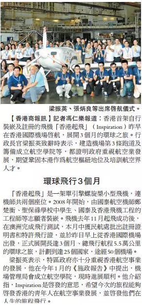 香港商报报道:香港首架自行装嵌及注册的飞机“香港起飞”(Inspiration)昨早在香港国际机场启航,展开3个月的环球之旅。行政长官梁振英致辞时表示,建造机场第3条跑道及筹备成立航空学院等,都证明政府重视航空业发展,期望巩固本港作为航空枢纽地位及培训航空界人才。